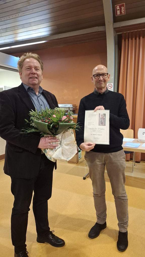 Genau am Tag der Hl. Cäcilia am 22. November feierte die Chorgemeinschaft St. Cäcilia & Heilig Kreuz das jährliche Cäcilienfest mit Familienangehörigen, ehemaligen Mitsänger/innen und Fördermitgliedern. Mit dem „Instrument des Jahres 2025“, nämlich unseren Stimmen, feierten wir zunächst die Hl. Messe mit der Gemeinde. Danach ging es in das adventlich präsentierte Pfarrheim (Adventsbasar der KFD) zum gemeinsamen Essen und gemütlichen Feiern. In diesem Jahr konnten wir Sängerinnen und Sänger für 25, 40 und 55 Jahre (!) aktiven Singens in der Kirchenmusik ehren. Allen Jubilar/innen auch an dieser Stelle einen herzlichen Glückwunsch und Dank für das langjährige Mit-Tun sowie weiterhin viel Freude bei der Umsetzung dessen, zu dem der Psalmist aufruft: „Singt dem Herrn ein neues Lied!“